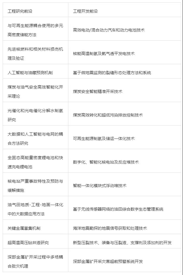 能源與礦業(yè)工程領(lǐng)域研判的Top12工程研究前沿和Top12工程開(kāi)發(fā)前沿,涵蓋了能源和電氣科學(xué)技術(shù)與工程、核科學(xué)技術(shù)與工程、地質(zhì)資源科學(xué)技術(shù)與工程、礦業(yè)科學(xué)技術(shù)與工程4個(gè)學(xué)科。