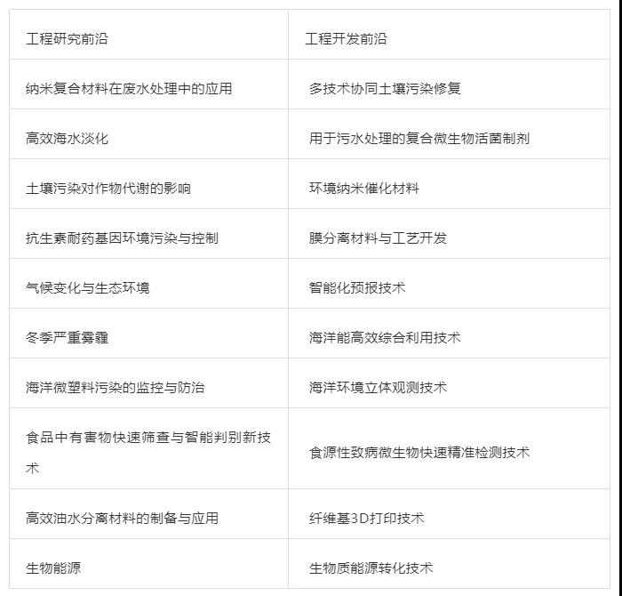 環(huán)境與輕紡工程領(lǐng)域所研判的Top10工程研究前沿和Top10工程開(kāi)發(fā)前沿涉及環(huán)境科學(xué)工程、氣象科學(xué)工程、海洋科學(xué)工程、食品科學(xué)工程、紡織科學(xué)工程以及輕工科學(xué)工程等6個(gè)學(xué)科方向。