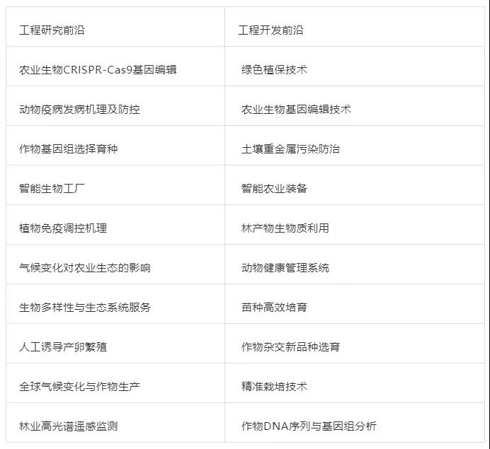 農(nóng)業(yè)領(lǐng)域的Top10工程前沿涉及農(nóng)業(yè)作物、植物保護(hù)、畜牧獸醫(yī)、農(nóng)業(yè)裝備、資源利用等學(xué)科方向。