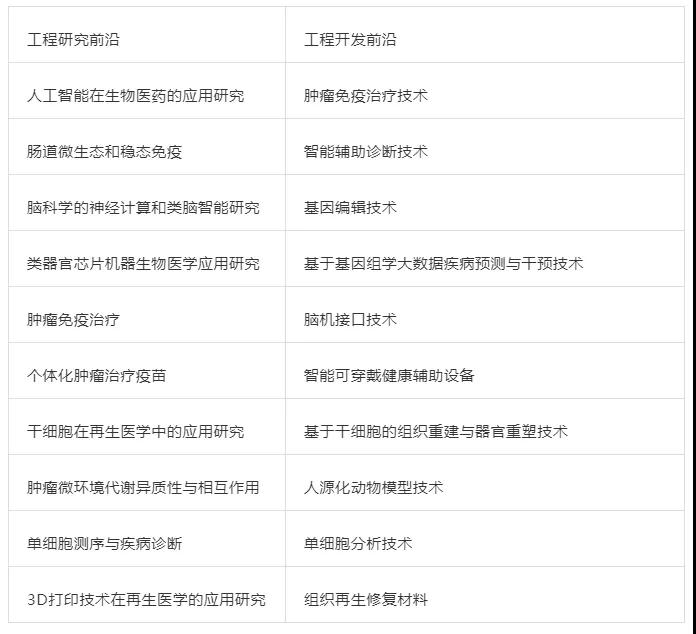 醫(yī)藥衛(wèi)生領(lǐng)域的Top10工程研究前沿和Top10工程開(kāi)發(fā)前沿,涉及基礎(chǔ)醫(yī)學(xué)、臨床醫(yī)學(xué)、醫(yī)學(xué)信息學(xué)與生物醫(yī)學(xué)工程、藥學(xué)、公共衛(wèi)生與預(yù)防醫(yī)學(xué)等學(xué)科方向。