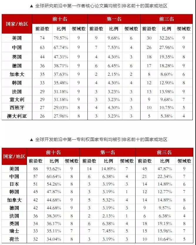在全球研究前沿中第一作者核心論文篇均被引排名前十的國(guó)家或地區(qū)和全球開(kāi)發(fā)前沿中第一專(zhuān)利權(quán)國(guó)家專(zhuān)利均被引排名前十的國(guó)家或地區(qū)中,美國(guó)各個(gè)領(lǐng)域的工程前沿均有涉及,前沿研究與開(kāi)發(fā)活躍,首發(fā)和引領(lǐng)性穩(wěn)居全球首位。