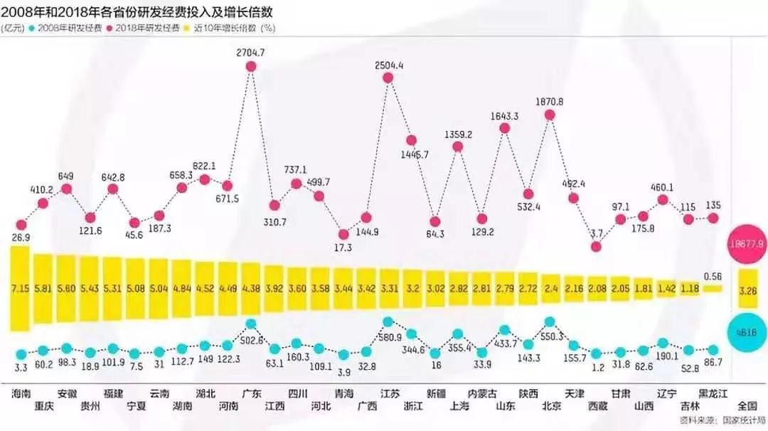 從近十年的增長幅度來看,海南、重慶、安徽、貴州、福建、寧夏、云南、湖南、湖北和河南位列前十。其中,海南十年增長了7.15倍,高居第一。當(dāng)然海南增幅高,也跟基數(shù)較低有關(guān)。2008年,海南研發(fā)經(jīng)費投入僅3.3億元,位列全國倒數(shù)第二。十年后達(dá)到了26.9億元,研發(fā)經(jīng)費在全國的位次上升了一位。