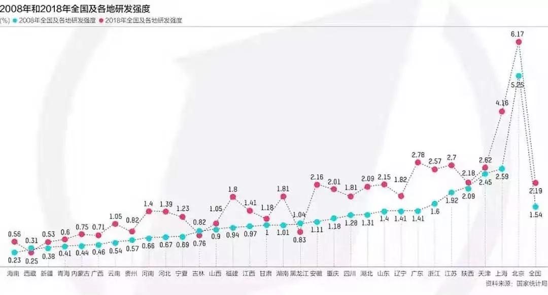 到2018年,共有14個省份的研發(fā)經(jīng)費超過了500億元,位居前十的分別是廣東、江蘇、北京、山東、浙江、上海、湖北、四川、河南、湖南。相比2018年,遼寧和天津退出了前十行列,其中,遼寧下滑至第17位,天津下滑至第15位。河南上升至第九,湖南上升至第十。前十中,中西部省份達(dá)到了4個之多。