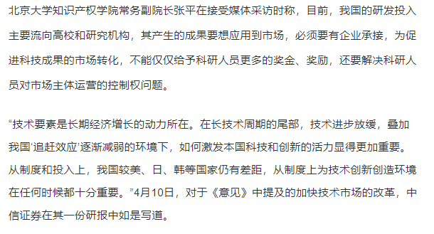 “技術(shù)要素改革的重點(diǎn)在于激發(fā)技術(shù)的供給活力,以提高我國(guó)的研發(fā)創(chuàng)新水平,實(shí)現(xiàn)高質(zhì)量發(fā)展?!贝舜渭夹g(shù)要素的改革主要發(fā)力點(diǎn)在于兩方面,一是產(chǎn)權(quán)激勵(lì)鼓勵(lì)創(chuàng)新,二是促進(jìn)科技成果轉(zhuǎn)化。