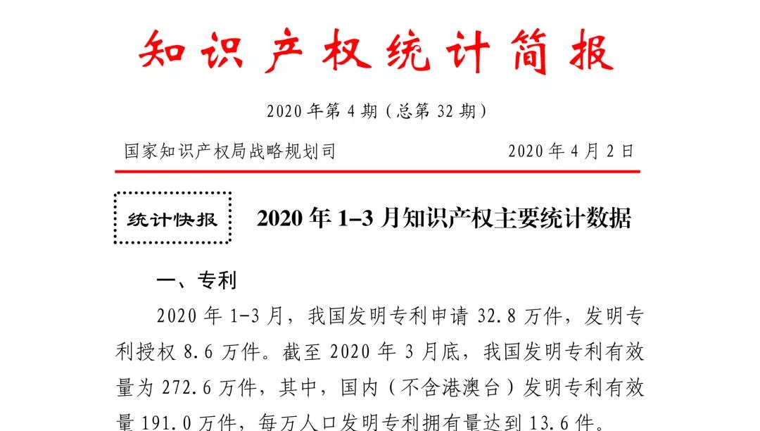 據(jù)國家知識產(chǎn)權局發(fā)布2020年1--3月知識產(chǎn)權主要統(tǒng)計數(shù)據(jù)顯示:2020 年 1-3 月,我國發(fā)明專利申請 32.8 萬件,發(fā)明專利授權 8.6 萬件;實用新型專利申請 56.4 萬件,實用新型專利授權 34.4 萬件;外觀設計專利申請 13.1 萬件,外觀設計專利授權 14.8 萬件;受理 PCT 國際專利申請 1.27 萬件;2020 年 1-3 月,我國商標申請量為 158.2 萬件,商標注冊量為 136.7 萬件。核準使用地理標志產(chǎn)品專用標志企業(yè) 189 家,核準注冊地理標志商標 160 件;集成電路布圖設計登記申請 1657件,發(fā)證 2071 件。