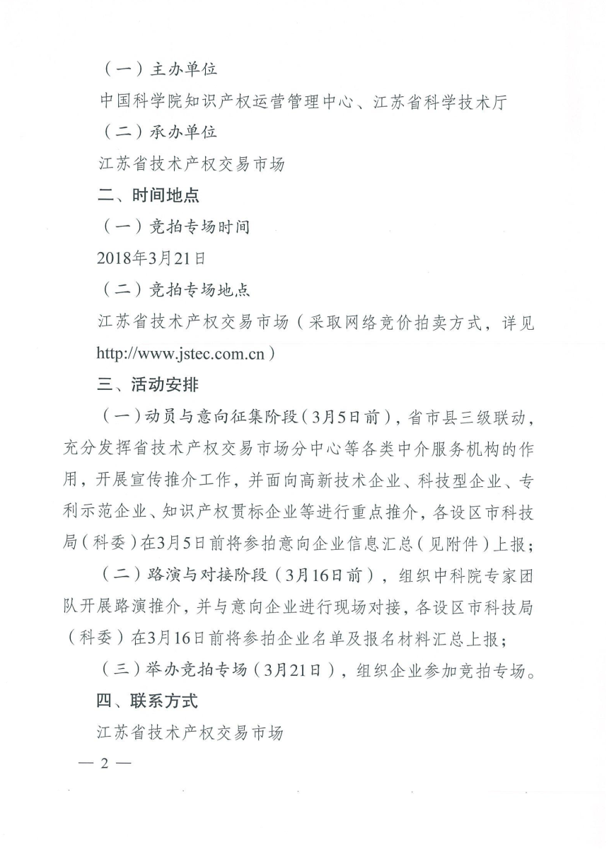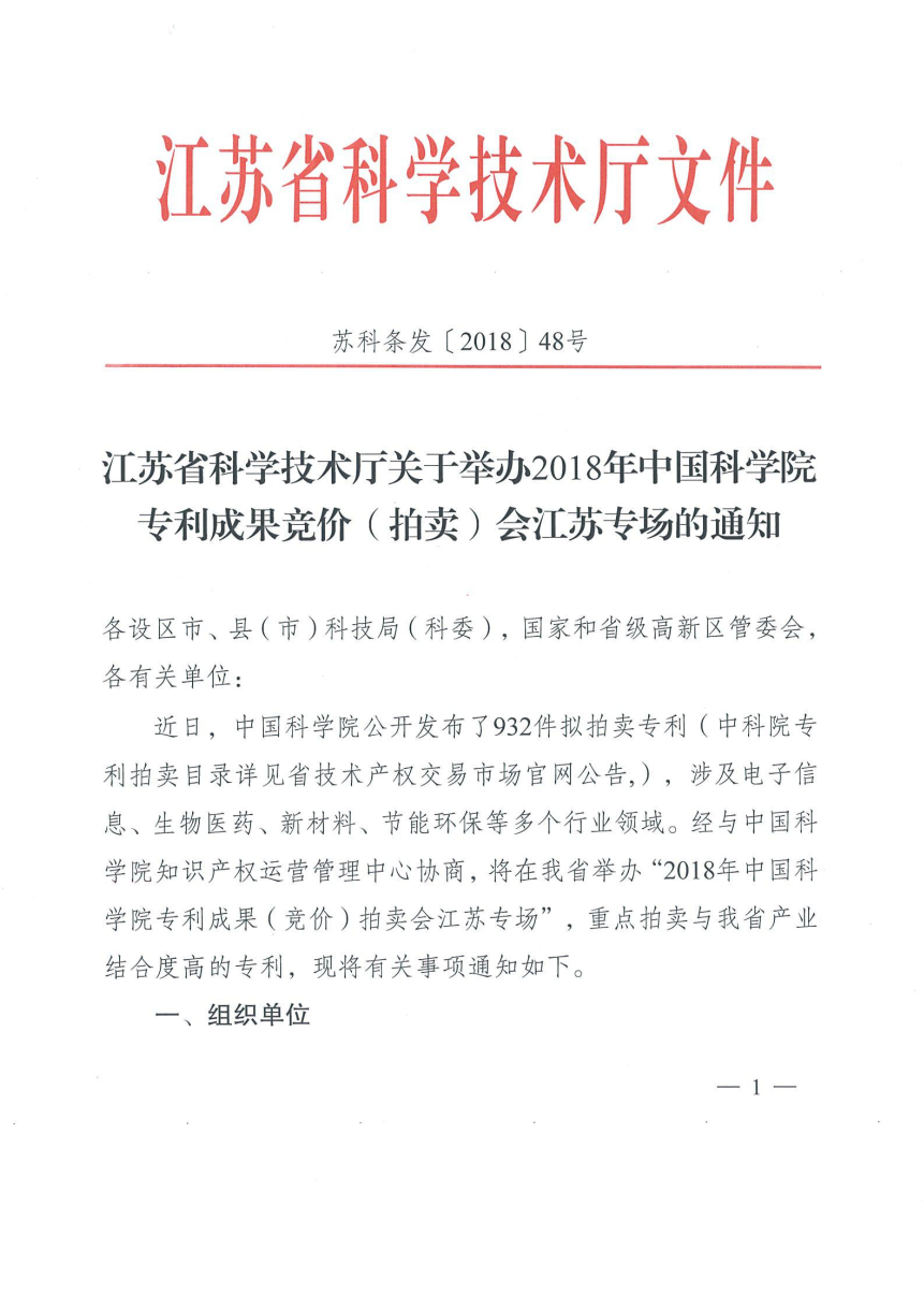江蘇省科技廳關(guān)于舉辦2018年中國(guó)科學(xué)院專利成果競(jìng)價(jià)(拍賣)會(huì)江蘇專場(chǎng)的通知