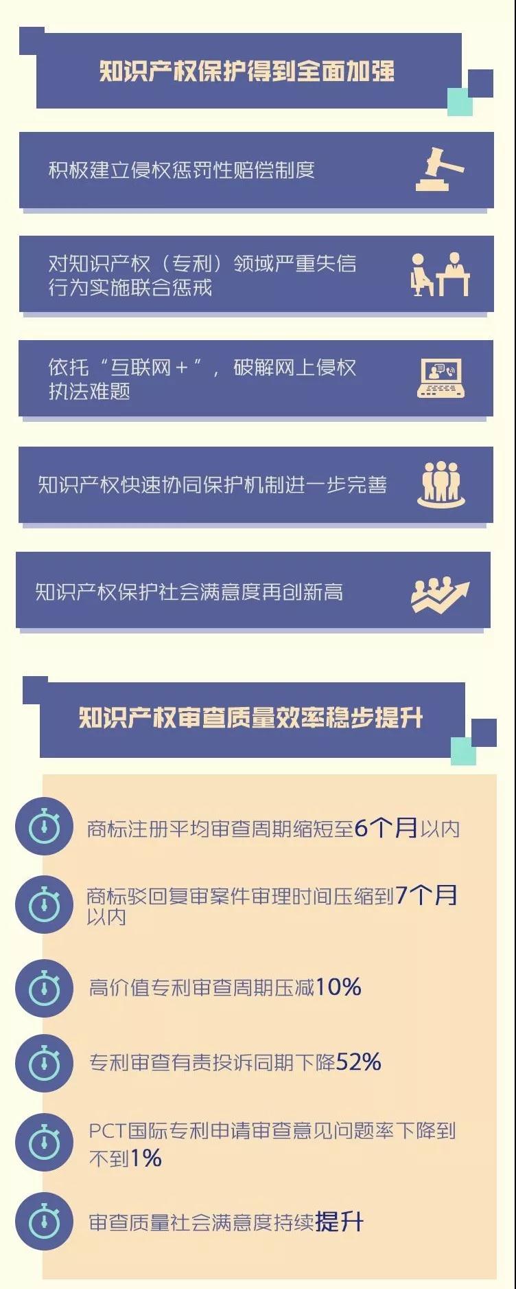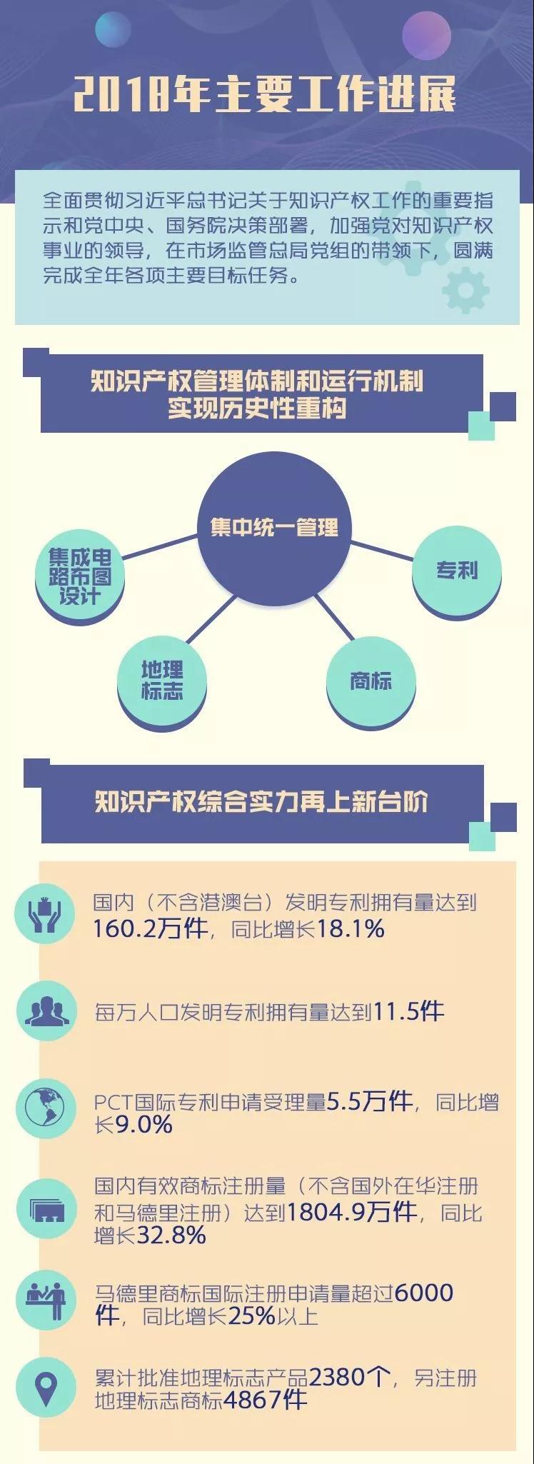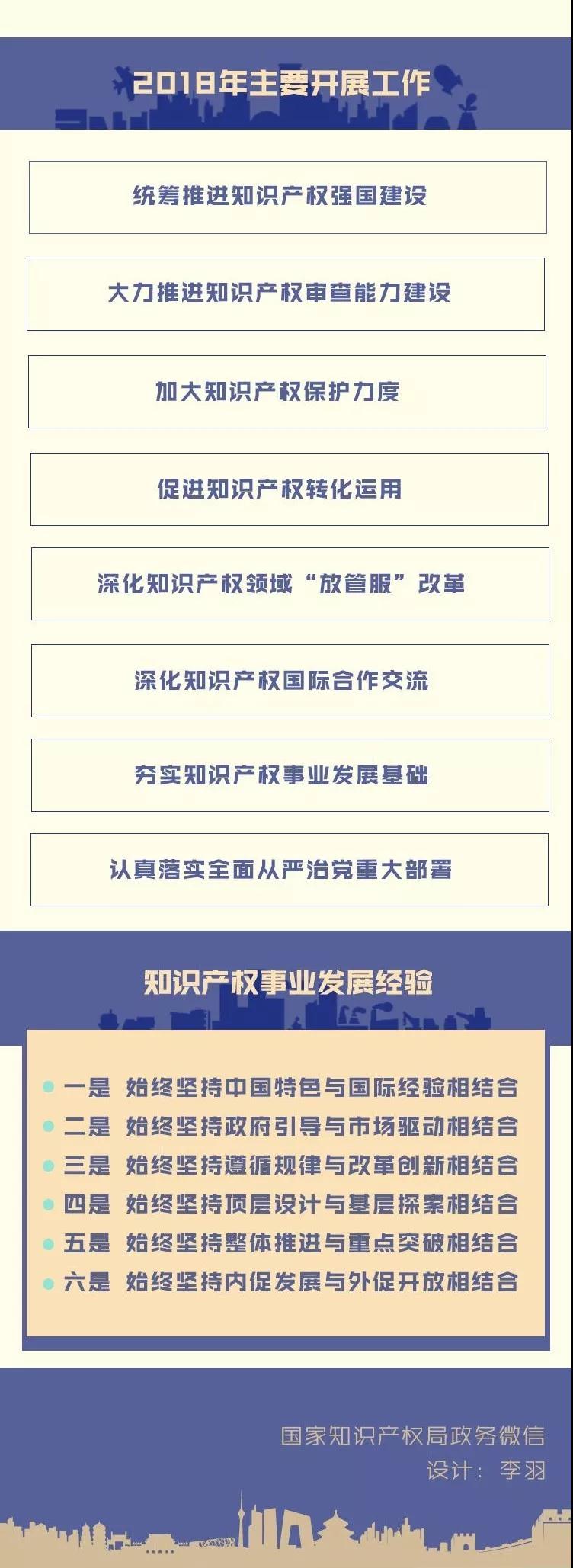 申長雨在工作報(bào)告中總結(jié)了2018年主要工作,報(bào)告指出,2018年,我國知識(shí)產(chǎn)權(quán)管理體制和運(yùn)行機(jī)制實(shí)現(xiàn)歷史性重構(gòu),知識(shí)產(chǎn)權(quán)綜合實(shí)力再上新臺(tái)階,知識(shí)產(chǎn)權(quán)保護(hù)得到全面加強(qiáng),知識(shí)產(chǎn)權(quán)審查質(zhì)量效率穩(wěn)步提升,知識(shí)產(chǎn)權(quán)運(yùn)用效益快速增長,知識(shí)產(chǎn)權(quán)在國家對外開放中的地位進(jìn)一步凸顯。