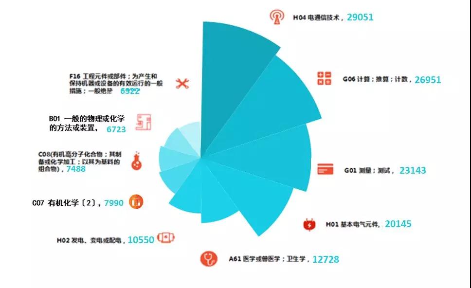 統(tǒng)計2019上半年中華人民共和國國家知識產(chǎn)權局公告授權的發(fā)明專利,從IPC分類(大類)來看,技術構成主要集中在H04(電通信技術)、G06(計算;推算;計數(shù))、G01(測量;測試)、H01(基本電氣元件)、A61(醫(yī)學或獸醫(yī)學;衛(wèi)生學)幾個大類中。
