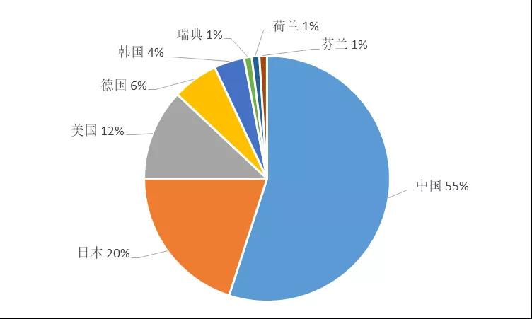 統(tǒng)計2019上半年中華人民共和國國家知識產(chǎn)權局公告的發(fā)明專利授權數(shù)量,其中82.16%的申請人國別為中國,其次為日本6.53%、美國5.03%、德國2.13%和韓國2.03%等。此次入榜前100名的企業(yè)主要來自8個國家,其中中國占比55%、日本占比20%、美國占比12%,德國占比6%、韓國占比4%,瑞典、荷蘭和芬蘭各占比1%。