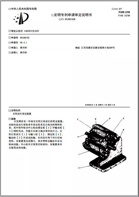 1985年4月1日,江蘇省徐州市新沂縣的個(gè)人申請(qǐng)人胡書彬提交了我省第一件專利申請(qǐng),專利號(hào):85100152.1,專利名稱:柔性滾柱變速裝置,技術(shù)領(lǐng)域:機(jī)械工程-機(jī)器零件。該項(xiàng)發(fā)明提出一種改進(jìn)的具有柔性行星滾柱的變速裝置,它具有變速范圍大、零轉(zhuǎn)速輸出、正反換向以及無(wú)級(jí)變速的功能。