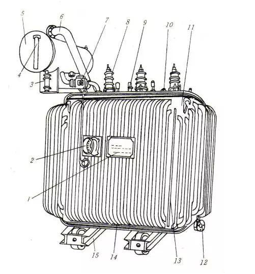 1-銘牌;2-信號(hào)式溫度計(jì);3-吸濕器;4-油標(biāo);5-儲(chǔ)油柜;6-安全氣道;7-氣體繼電器;8-高壓套管;9-低壓套管;10-分接開(kāi)關(guān);11-油箱;12-放油閥門(mén);13-器身;14-接地板;15-小車;16壓力釋放閥(補(bǔ)充:圖左上側(cè))