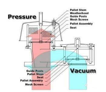 當罐內壓力升高到定壓值時,將壓力閥打開,罐內氣體通過呼氣閥(即壓力閥)側排入外界大氣中,此時真空閥由于受到罐內正壓作用處于關閉狀態(tài)。反之,當罐內壓力下降到一定真空度時,真空閥由于大氣壓的正壓作用而打開,外界的氣體通過吸氣閥(即真空閥)側進人罐內,此時壓力閥處于關閉狀態(tài)。在任何時候,壓力閥和真空閥不能同時處于打開的狀態(tài)。當罐內壓力或真空度降到正常操作壓力狀態(tài)時,壓力閥和真空閥處于關閉狀態(tài),停止呼氣或吸氣過程。