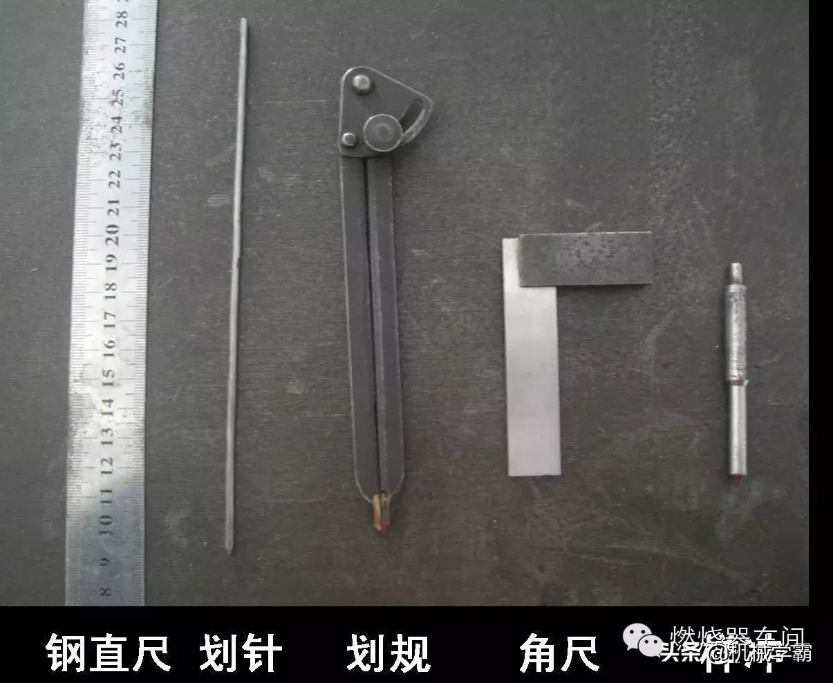 3.繪劃工具,包括劃針、劃線盤、高度游標(biāo)尺、劃規(guī)、劃卡、平尺、曲線板以及手錘、樣沖等。