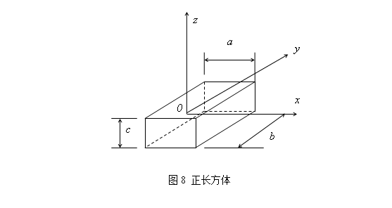 上節(jié)提到Jz 為剛體對(duì)轉(zhuǎn)軸的轉(zhuǎn)動(dòng)慣量,它和物體平動(dòng)的慣性量(即質(zhì)量)類似。當(dāng)轉(zhuǎn)動(dòng)慣量越大時(shí),轉(zhuǎn)動(dòng)它越困難,或者使它轉(zhuǎn)動(dòng)角速度增大越困難。具有相同質(zhì)量的物體,形狀不同,其轉(zhuǎn)動(dòng)慣量大小不同。以圖8所示實(shí)心長(zhǎng)方體為例。這是一個(gè)三維尺寸為 aⅹbⅹc 的長(zhǎng)方體,為簡(jiǎn)單起見(jiàn),令b =