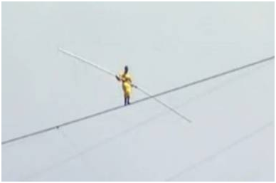 另外,與轉(zhuǎn)動(dòng)慣量有關(guān)的例子還有高空走鋼絲。圖10是阿迪力在新疆喀納斯高空走鋼絲的照片。你看他兩手緊握一根很長(zhǎng)的平衡桿。這根平衡桿與他的身體緊緊結(jié)合為一體,總的轉(zhuǎn)動(dòng)慣量大大增加。一個(gè)很大轉(zhuǎn)動(dòng)慣量的物體,是不易被轉(zhuǎn)動(dòng)的,所以他的直立狀態(tài)較為穩(wěn)定,比較安全。相反,如果沒(méi)有這個(gè)平衡桿,他煢煢一身走在鋼絲上,就很易翻倒。這就是走鋼絲的人必須握有平衡桿的力學(xué)奧秘。