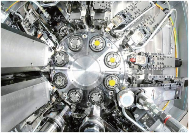 INDEX MS40C-8多軸自動(dòng)車床的核心部件是緊湊型主軸鼓輪,帶有8個(gè)采用同步驅(qū)動(dòng)技術(shù),并采用液體冷卻的電主軸。這些電主軸轉(zhuǎn)速可達(dá)到7,000 rpm,功率達(dá)到24kW,扭矩高達(dá)57Nm。這些電主軸具有無(wú)級(jí)變速控制,高扭矩和緊湊設(shè)計(jì)的特點(diǎn),并且不需要維護(hù)。由于主軸和刀架數(shù)量的增加,MS40C-8完全能夠在一個(gè)工序中加工高度復(fù)雜的零件。機(jī)床有兩個(gè)同步驅(qū)動(dòng)的旋轉(zhuǎn)主軸,每個(gè)主軸都有7把刀具進(jìn)行加工,其中4把可以是動(dòng)力刀具。另外,機(jī)床的另一大特點(diǎn)是2把刀具在工件上進(jìn)行同步切削。