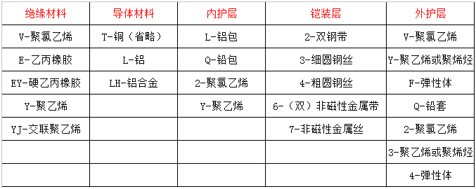 如:V—PVC塑料、YJ—XLPE絕緣、 Y—聚乙烯料 、F—聚四氟乙烯