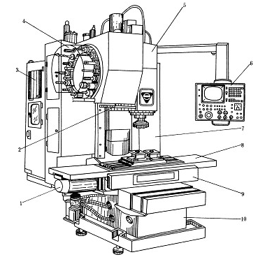 組成:數(shù)控系統(tǒng)、機(jī)體、主軸、進(jìn)給系統(tǒng)、刀庫、換刀機(jī)構(gòu)、操作面板、托盤交換系統(tǒng)(或工作臺(tái))和輔助系統(tǒng)等。