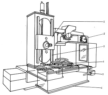 1-主軸頭 2-刀庫 3-立柱 4-立柱底座 5-工作臺(tái) 6-工作臺(tái)底座