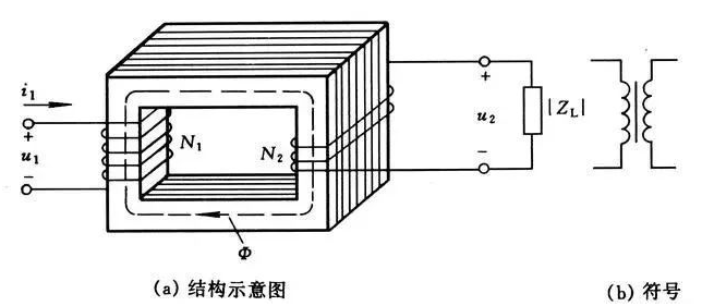 變壓器由鐵芯和繞組兩個基本部分組成,如下圖所示,是它的示意圖和符號。