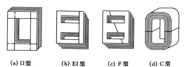 為了減少鐵芯中的磁滯損耗和渦流損耗,變壓器的鐵芯大多用0.35~0.5 mm厚的硅鋼片疊成,為了降低磁路的磁阻,一般采用交錯疊裝方式,即將每層硅鋼片的接縫錯開。如下圖所示為幾種常見的鐵芯形狀。