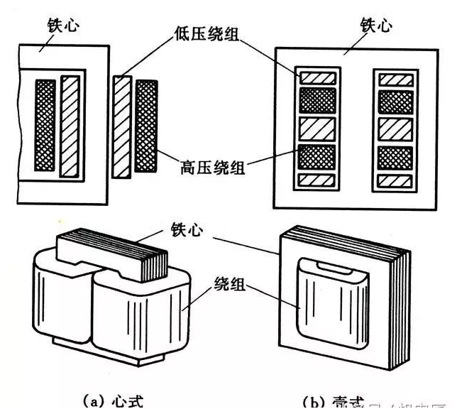 變壓器按鐵芯和繞組的組合方式,可分為心式和殼式兩種,如下圖所示。