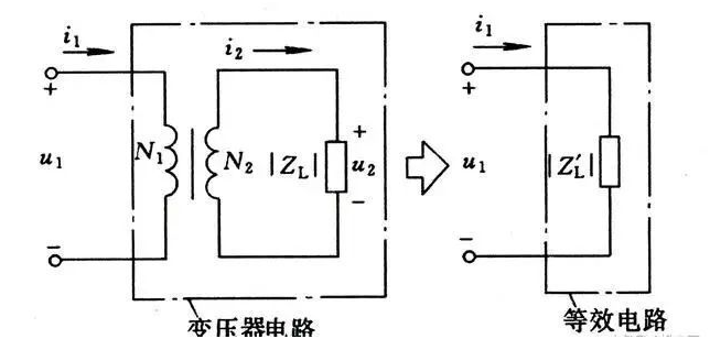 變壓器除了可以變壓和變流,還可以變換阻抗。如上圖所示,變壓器原邊接電源【u1】,副邊接負載阻抗【l ZL I】,對于電源來說,圖中點劃線框內(nèi)的電路可用另一個阻抗【l Z'LI】來等效代替。