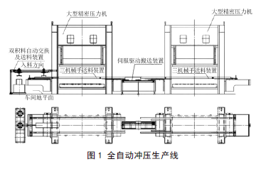 全自動沖壓生產(chǎn)線就是將各類技術(shù)集中與一體的大型自動沖壓生產(chǎn)線,生產(chǎn)線上有多臺精密壓力機同時進行工作。原材料的加工與運輸可以通過電機驅(qū)動的機械手來得以實現(xiàn),而現(xiàn)場總線控制機械手和大型精密壓力機則是對現(xiàn)場進行故障監(jiān)控與診斷,在生產(chǎn)金屬零件的過程中,實現(xiàn)全自動沖壓的生產(chǎn)線。以下圖中的兩臺主機連線金屬零件沖壓加工為例,機器人全自動沖壓生產(chǎn)線主要由雙積料自動交換以及送料裝置、大型精密壓力機、三維機械手送料裝置、伺服驅(qū)動半送裝置等組成(見圖1)。
