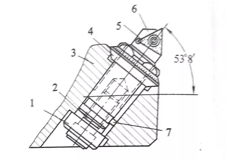 1 墊圈 2 拉緊螺釘 3 鏜刀桿 4 調(diào)整螺帽 5 刀片 6 鏜刀頭 7 導(dǎo)向鏈