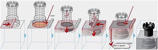 2、選區(qū)激光熔化金屬粉末組層堆積打?。ㄖ圃祀A段)