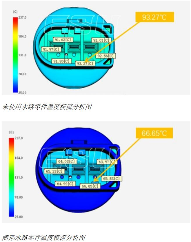 如圖我們可以看出整個連接器在使用隨形水路之后,最高溫66.65℃,比未使用水路的模溫低近30℃。因此整個零件的溫差相對較小,模溫均衡,從而降低變形率,提高產(chǎn)品質(zhì)量。