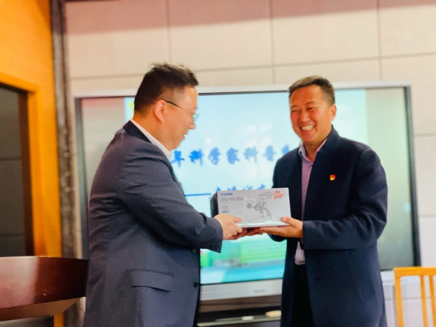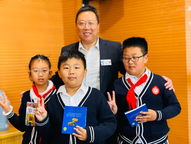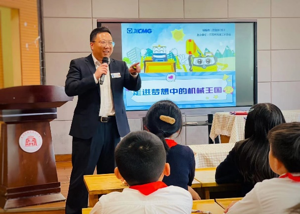 江蘇省機(jī)械工程學(xué)會青年工作委員會副主任委員、徐工集團(tuán)智能制造研究院副院長陸智俊在啟動儀式上向城東小學(xué)贈送流浪地球徐工“鋼鐵螳螂”挖掘機(jī)模型和工程車小百科圖書。