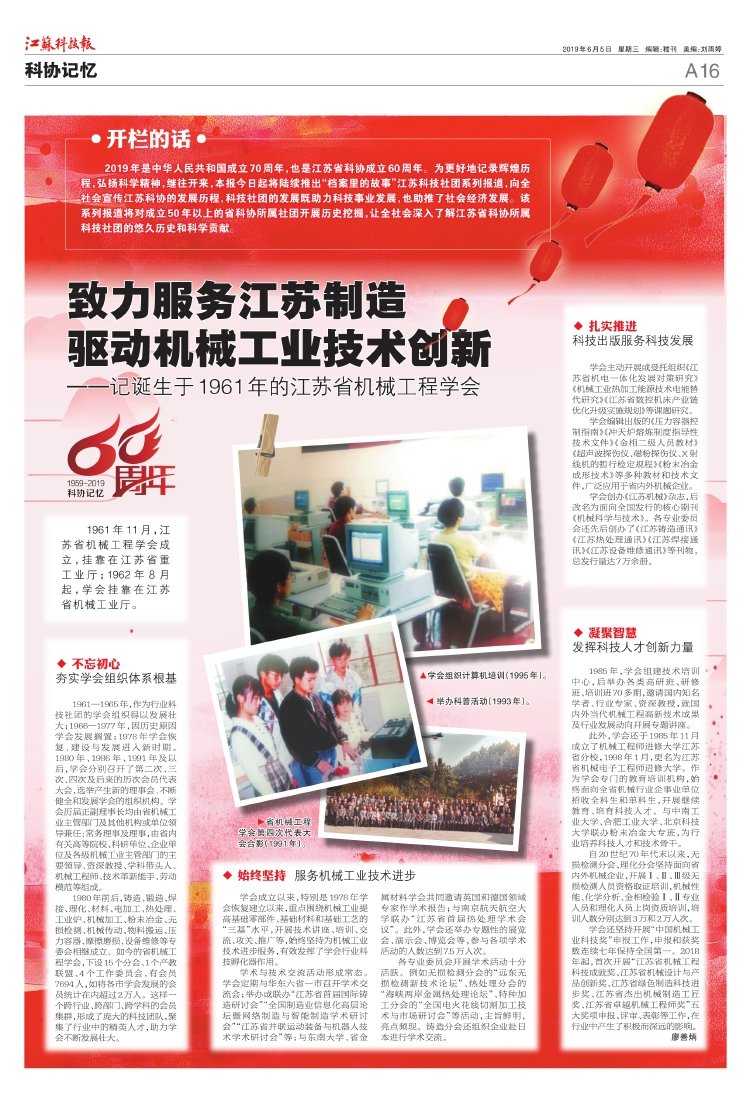6月5日出版的《江蘇科技報(bào)》,大紅主色調(diào)的A16整版, “致力服務(wù)江蘇制造,驅(qū)動(dòng)機(jī)械工業(yè)技術(shù)創(chuàng)新”的醒目標(biāo)題,報(bào)道了江蘇省機(jī)械工程學(xué)會(huì)近60年的發(fā)展歷程。這是《江蘇科技報(bào)》,在紀(jì)念新中國成立70周年、江蘇省科協(xié)成立60周年之際,推出的“檔案里的故事”開欄首篇重磅系列報(bào)道。
