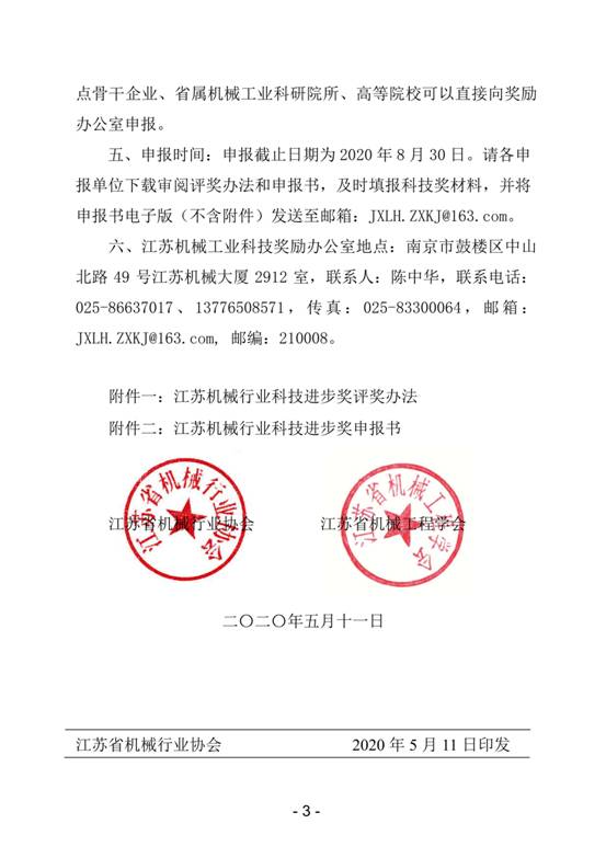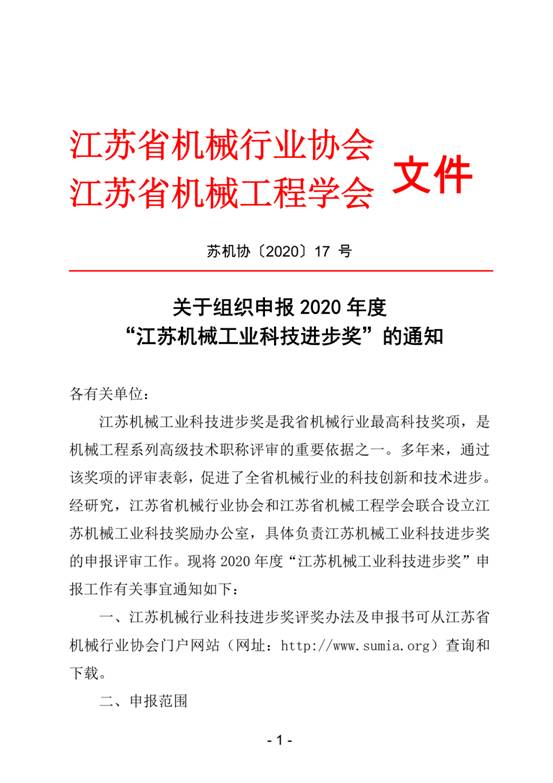 關(guān)于組織申報(bào)2020年度江蘇機(jī)械工業(yè)科技進(jìn)步獎(jiǎng)”的通知