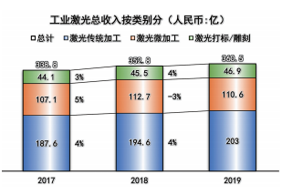 從圖3可見,在2019年切割和焊接這種傳統(tǒng)應(yīng)用仍然是最大部分,占總收入一半,與歷史狀況相同。高功率激光切割的增長率出現(xiàn)放緩的原因并不是市場飽和,而是主要由于全球制造業(yè)緊縮,因?yàn)橹圃鞓I(yè)出口貿(mào)易以及中國政府收緊對中國的外匯調(diào)整以及美國政府關(guān)稅上漲的影響。